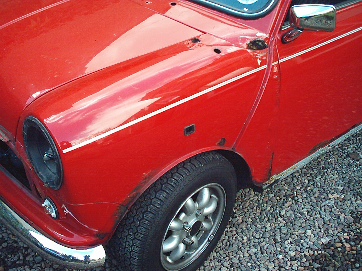 The bodywork had to be addressed, as it was in a bad way. So I decided to have some of the panels replaced and the car re-sprayed to bring the car back to its former glory. The photos, opposite, show just how bad the rust actually was before the Mini went away for it's two month long restoration. The back end of the car was in a reasonable condition for it's age, with the exception of the rear valance, only some surface rust needed attention. The main problems were on the front end. The scuttle had a hole in it, the A panels were nearly non-existent and there was a lot of rust on the doors, wings, front panel and bonnet. Before the Mini went off to be restored I also purchased all of the panels which were going to be replaced. Shown below are two A Panels, a Bonnet, two Wings, two Seam Strips, a Scuttle, a Rear Valance and a Front Panel. Also, not pictured, a Bootlid and two doors from a 1995 Rover Mini were sent off with the car to the restorer.