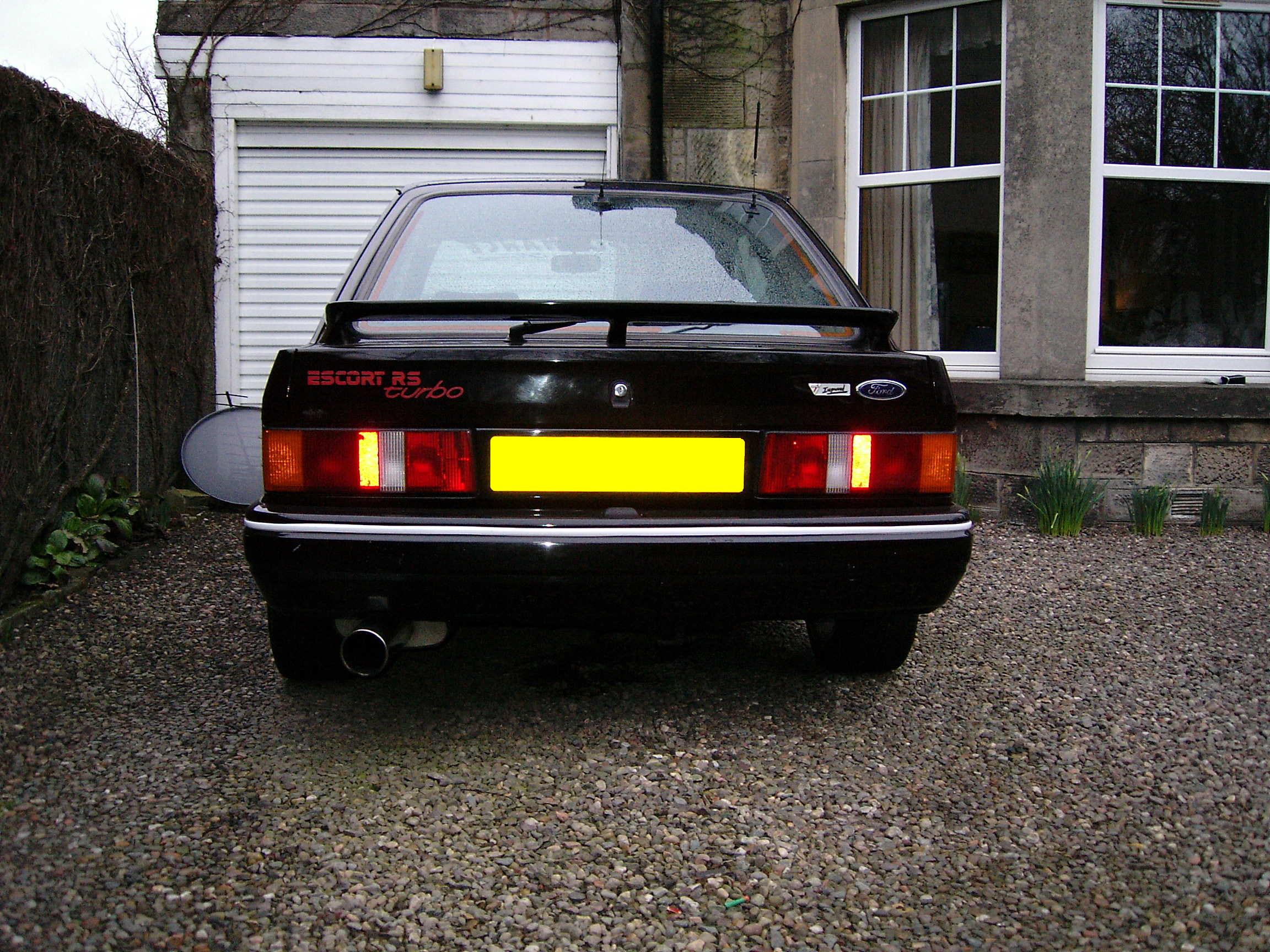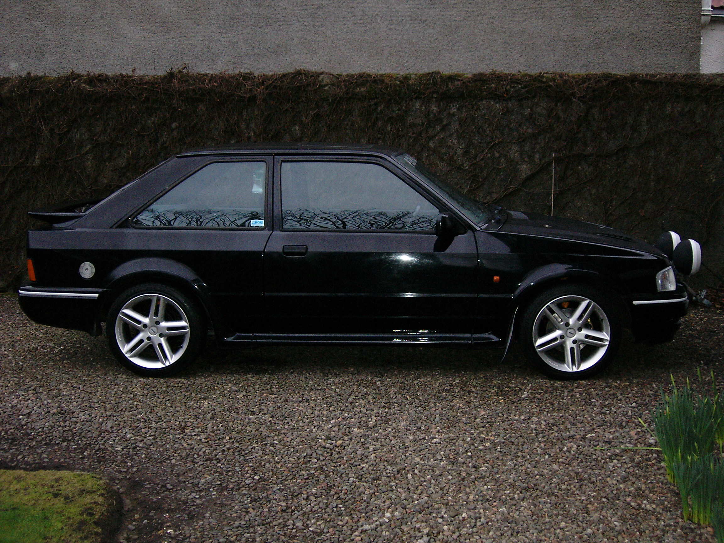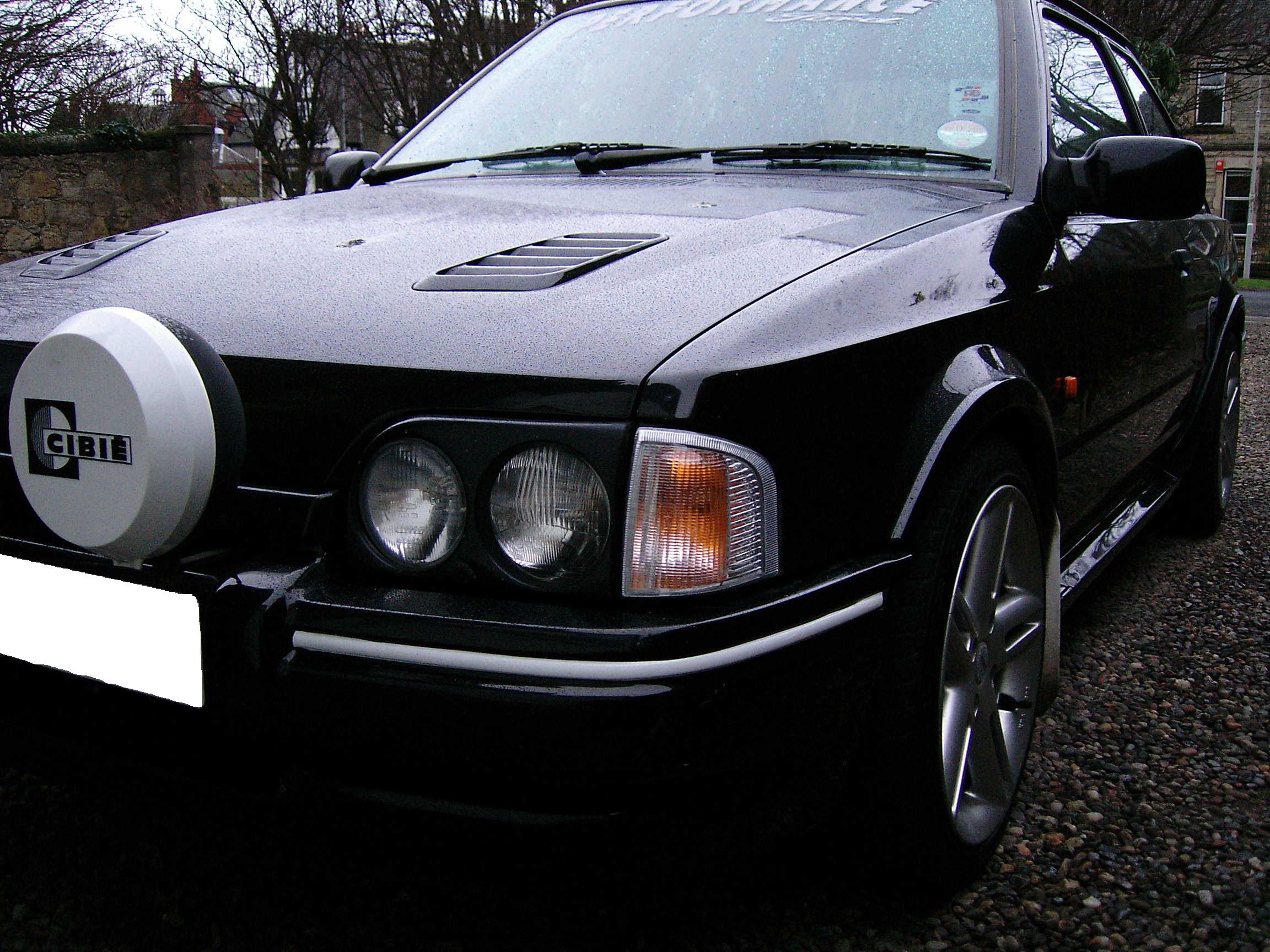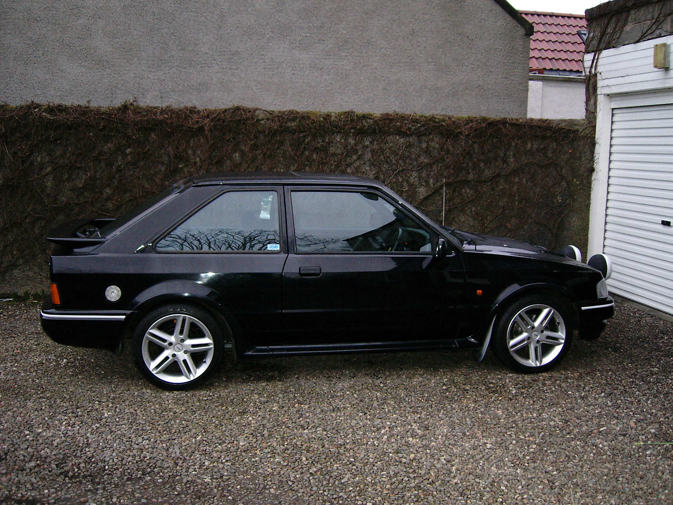 Facts1987 (D reg) Escort S2 RS Turbo in black, purchased in November 2004. Engine Capacity 1596 cc Power Output 133 bhp 0-60mph 8.2 secs Top Speed 128 mph The above figures are for a standard S2 RS Turbo, the figures for my car are not known at present, but will be posted once they are established. SpecEngine 1.6 CVH, Magnex stainless steel exhaust system, K&N induction kit, Bailey dump valve, superchip, Champion race plugs. Suspension Koni sport adjustable dampers Body Morette headlight conversion, de-locked doors, Cibie driving lamps Wheels 7.5x16 Momo Arrow wheels with Hancook Ventus Sport 205/45ZR tyres Security Clifford Eagle II system with pager, Clifford Sense & Tell IV, Cobra immobiliser